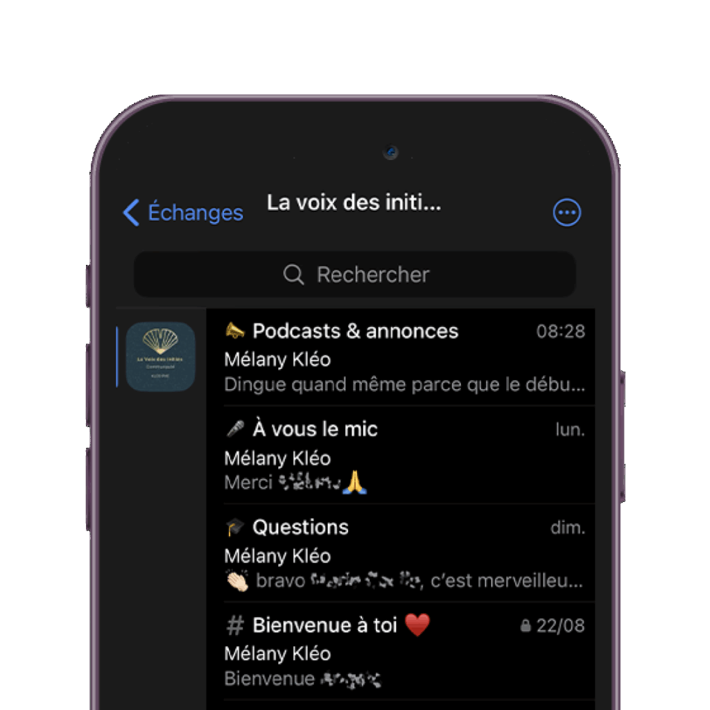 Tu rejoins un cercle privé sur Telegram où les membres partagent leurs ressentis, leurs expériences et leurs prises de conscience. C’est aussi l’endroit où Mélany transmet des guidances et du contenu exclusif, créant un lien continu et authentique entre chaque atelier.