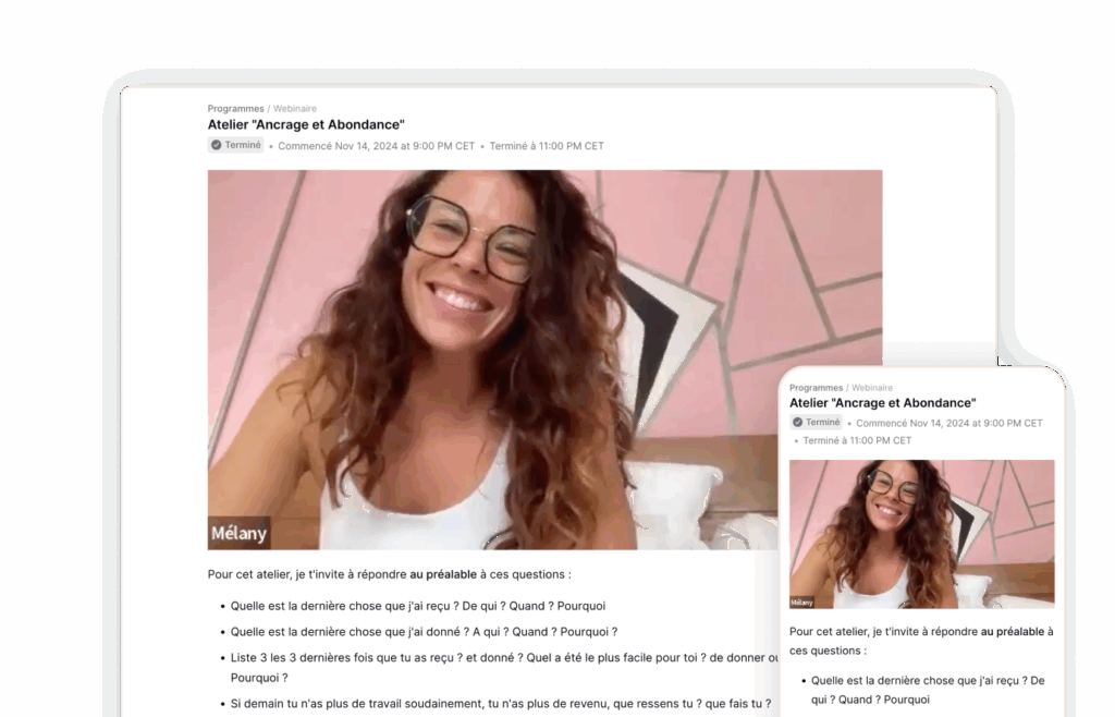 Chaque mois, tu es invité(e) à un atelier collectif animé en direct. Ces moments de rencontre sont l’occasion de pratiquer ensemble, de poser tes questions et de vivre l’énergie du groupe en temps réel. Tu reçois ensuite le replay pour garder une trace et y revenir quand tu le souhaites.